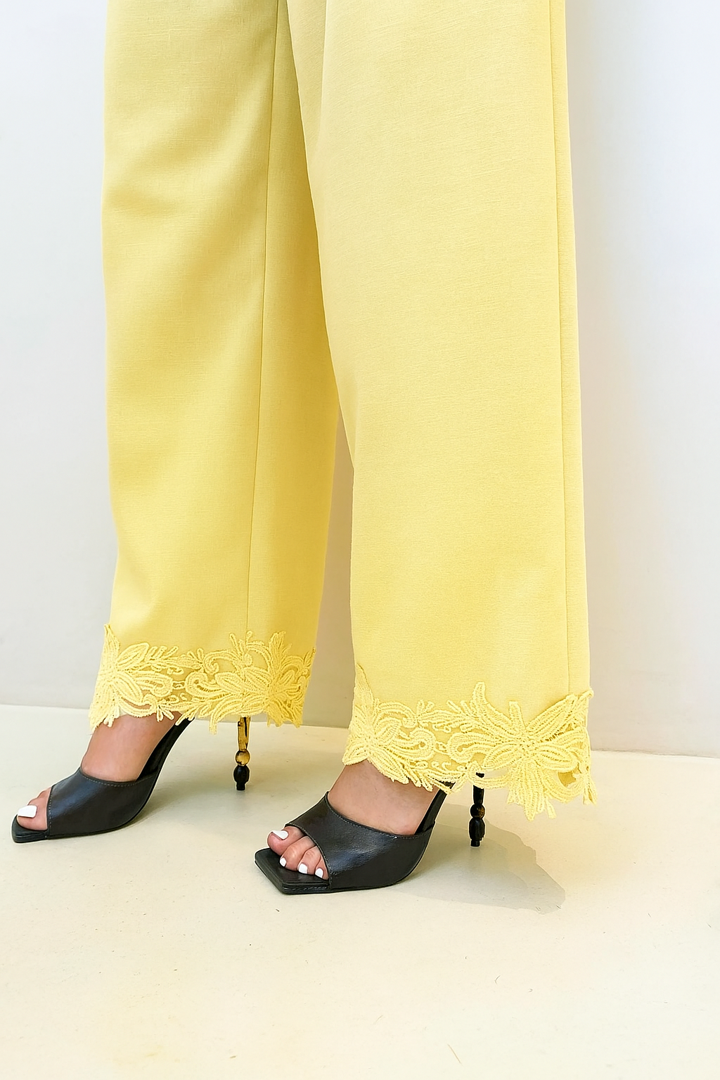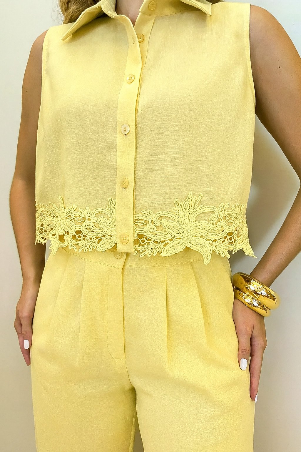 O top possui modelagem reta, gola clássica e fechamento frontal por botões, trazendo um toque de alfaiataria ao visual. O destaque fica por conta da aplicação em renda delicada na barra, que adiciona charme e um ar romântico à produção. A calça apresenta corte reto e cintura alta, com pregas frontais que garantem caimento perfeito e alongam a silhueta.