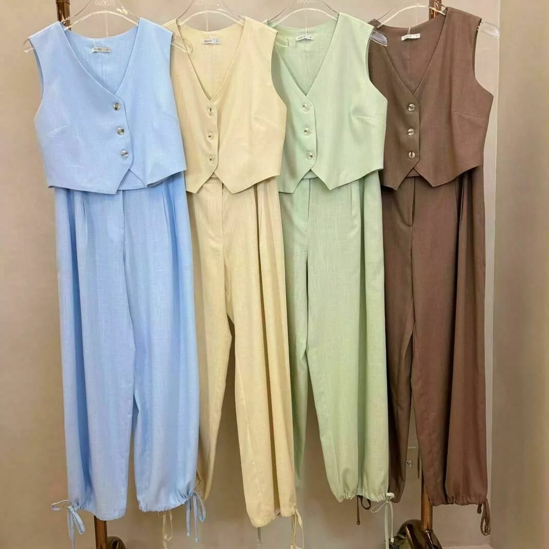 O colete possui modelagem reta, botões frontais e recorte discreto que valoriza a cintura com charme sutil. Já a calça apresenta caimento fluido com amarração nos tornozelos, proporcionando movimento e um toque fashionista.
