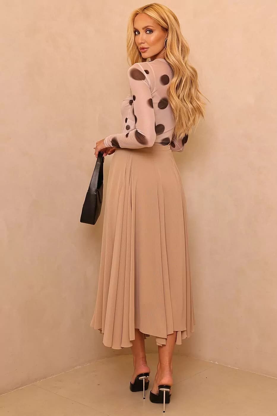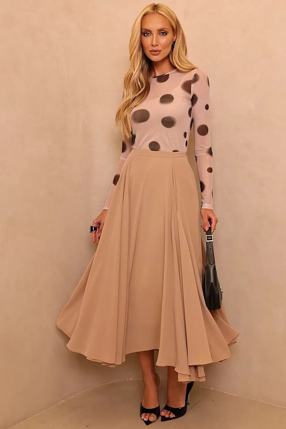 A Saia Jéssica é a peça perfeita para quem busca elegância e movimento em um só look. Com modelagem godê fluida e cintura alta, ela valoriza a silhueta e proporciona um caimento impecável, trazendo um toque de sofisticação atemporal.