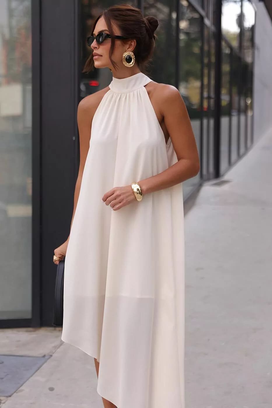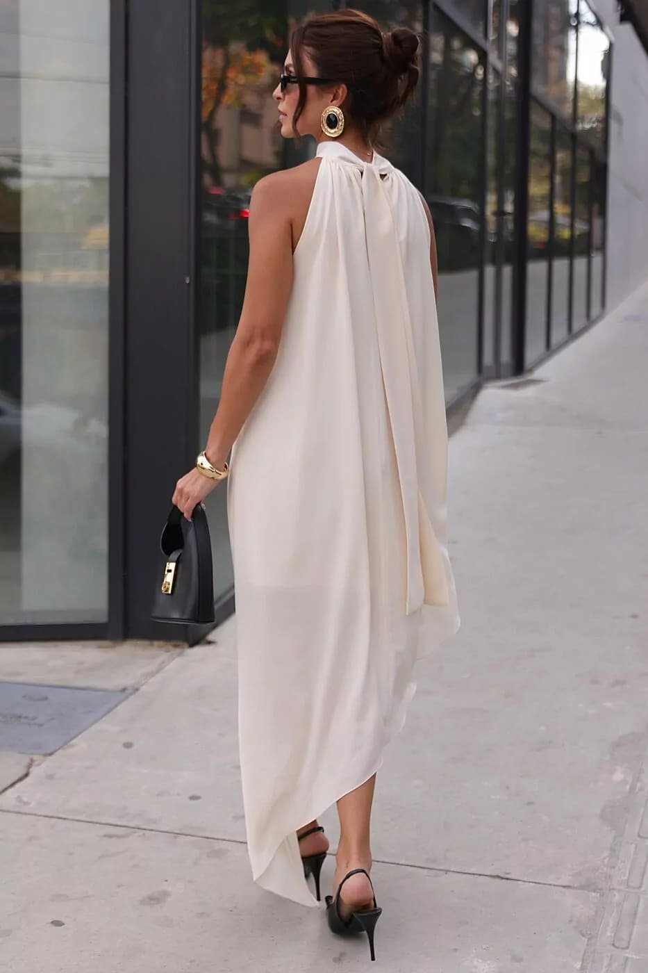 O design assimétrico e o corte solto garantem leveza e movimento, enquanto o decote halter confere um toque de refinamento e alonga a silhueta. O detalhe de amarração lateral adiciona charme e fluidez à peça, tornando-a versátil e atemporal.